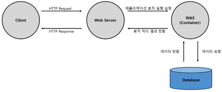 나오는 용어는 request와 response가 나오며 클라이언트는 웹서버에게 request(요청)을 하고 그럼 웹서버에서 was컨테이너로 로직 실행 요청을 하며 was는 데이터베이스에서 로직 수행을 위한 데이터를 가져와서 로직을 수행하고 결과를 다시 웹서버로, 웹서버에서 클라이언트에게 반환을 하는데 그림으로 보면 이런 프로세스이다.