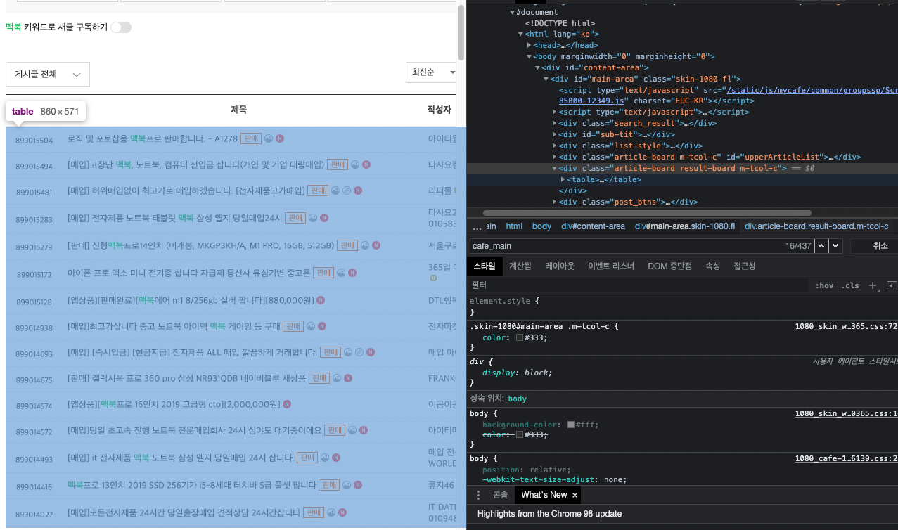 일단 저번시간 까지 했다면 중고나라 사이트에 들어가고 검색 칸에다가 '맥북' 이라고 검색해서 나오는 창까지는 만들수 있을 것이다.