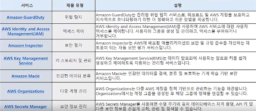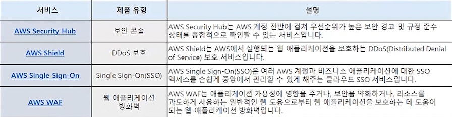 AWS 보안 서비스의 제품과 설명은 다음과 같다.