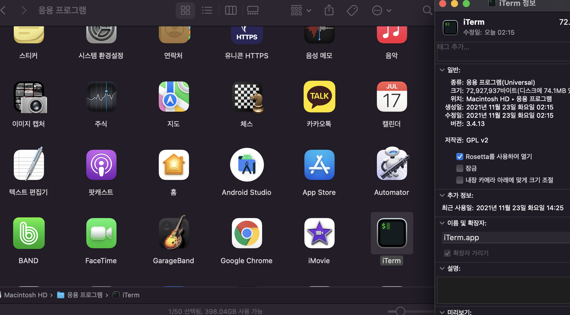 좀더 부가 설명을 넣어주면 iterm2를 설정해줘야하는데 파인더에서 응용프로그램을 보면 iterm 앱에서 오른쪽마우스 눌러서 정보보기 후에 로제타 사용 클릭하면 된다.
