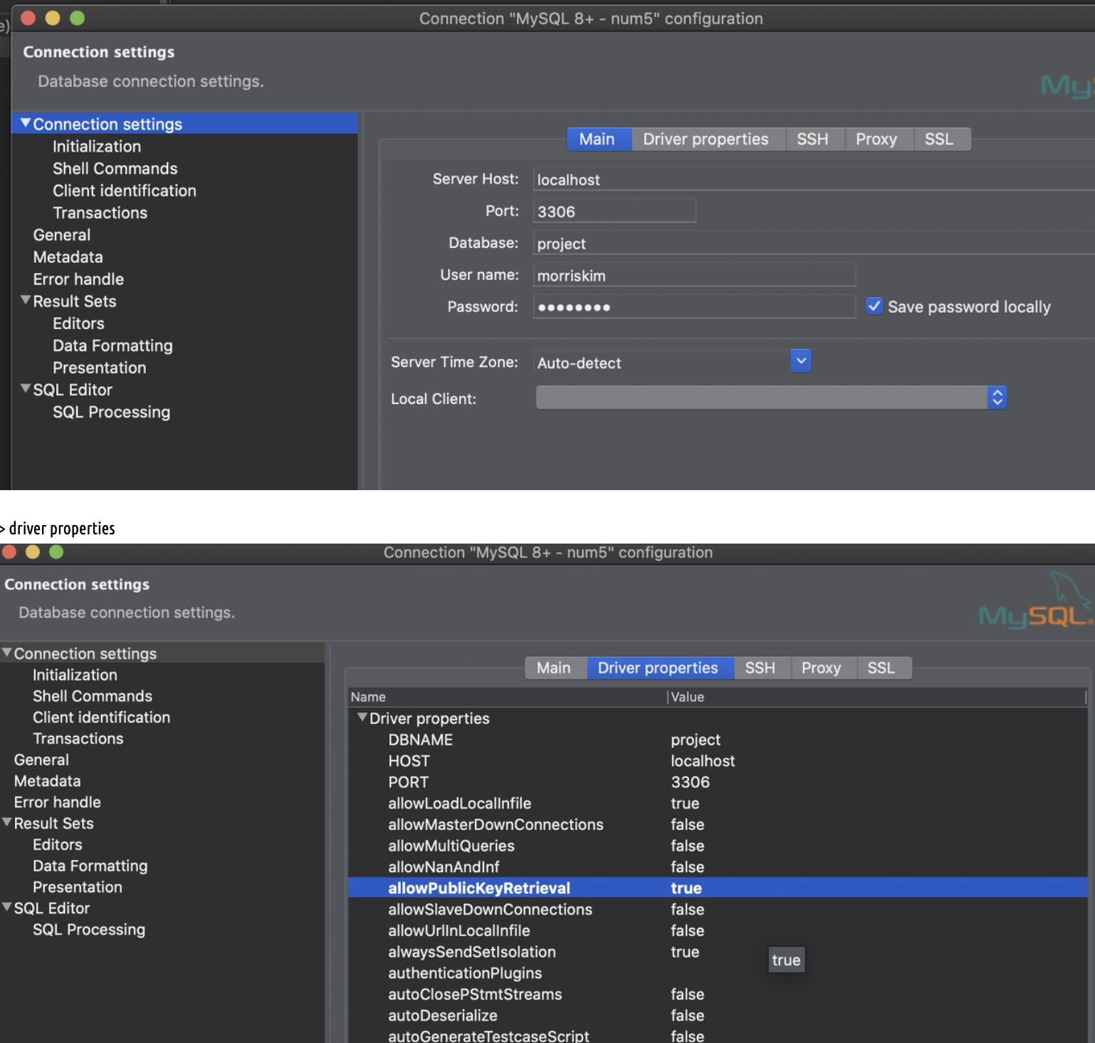 allowPublicKeyRetrieval=true 설정을 해줘야 했다.