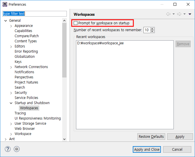 시작할때 다시 workspace를 선택하도록 물어보게 하려면 메뉴에서 "Window -> Preferences"를 선택하여 설정창을 연다. 설정창에서 "General -> Startup and Shutdown -> Workspaces" 를 선택