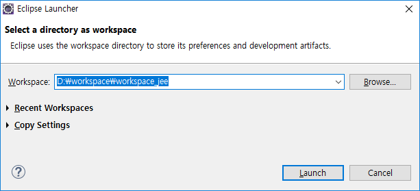 이클립스 프로젝트 파일이 저장되는 위치는 workspace로 설치시에 이 폴더를 지정한다.