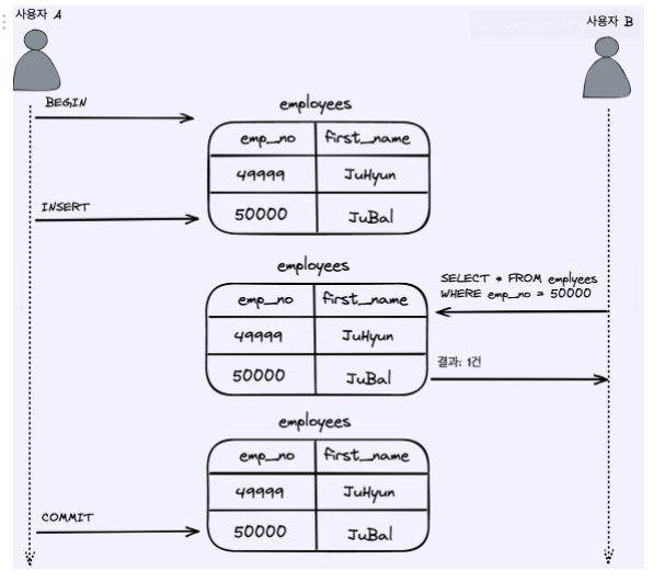아래 그림은 다른 트랜잭션에서 사용자 B가 실행하는 SELECT 쿼리의 결과에 사용자 A의 INSERT 쿼리가 COMMIT되기 전에 어떤 영향을 미치는지 보여주는 예시이다.