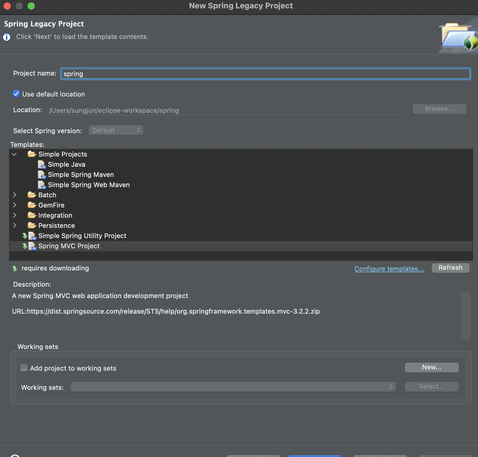 - file > new > other에서 spring검색후 springLegacyProject 생성 (적당한 프로젝트 이름 /패키지 명 설정)
