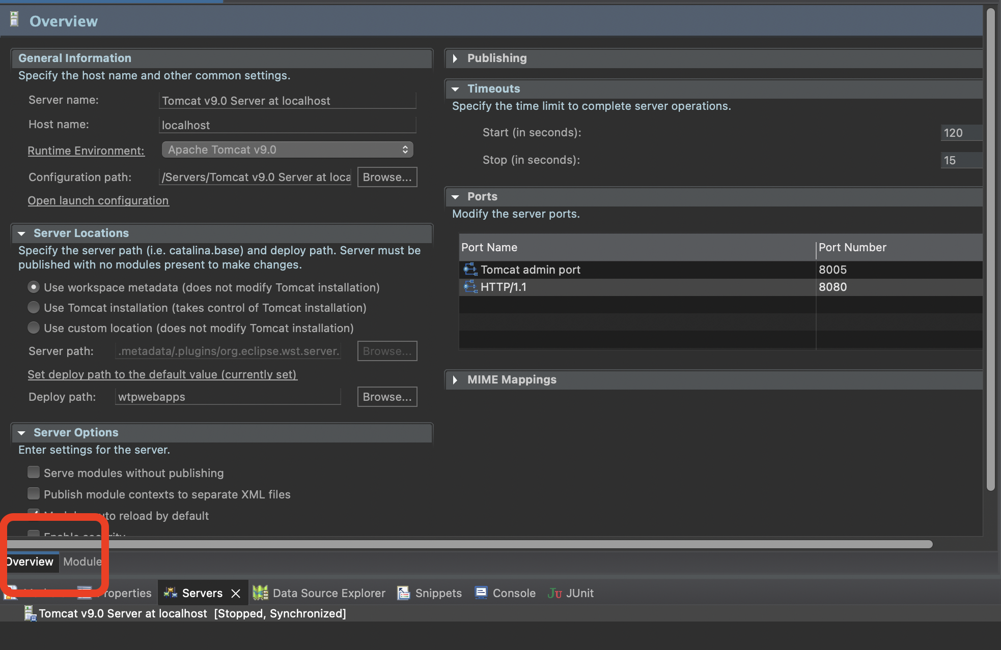 tomcat9 문구를 더블클릭하면 서버 설정 창이 나오는데 여기서 몇개 변경하였다.