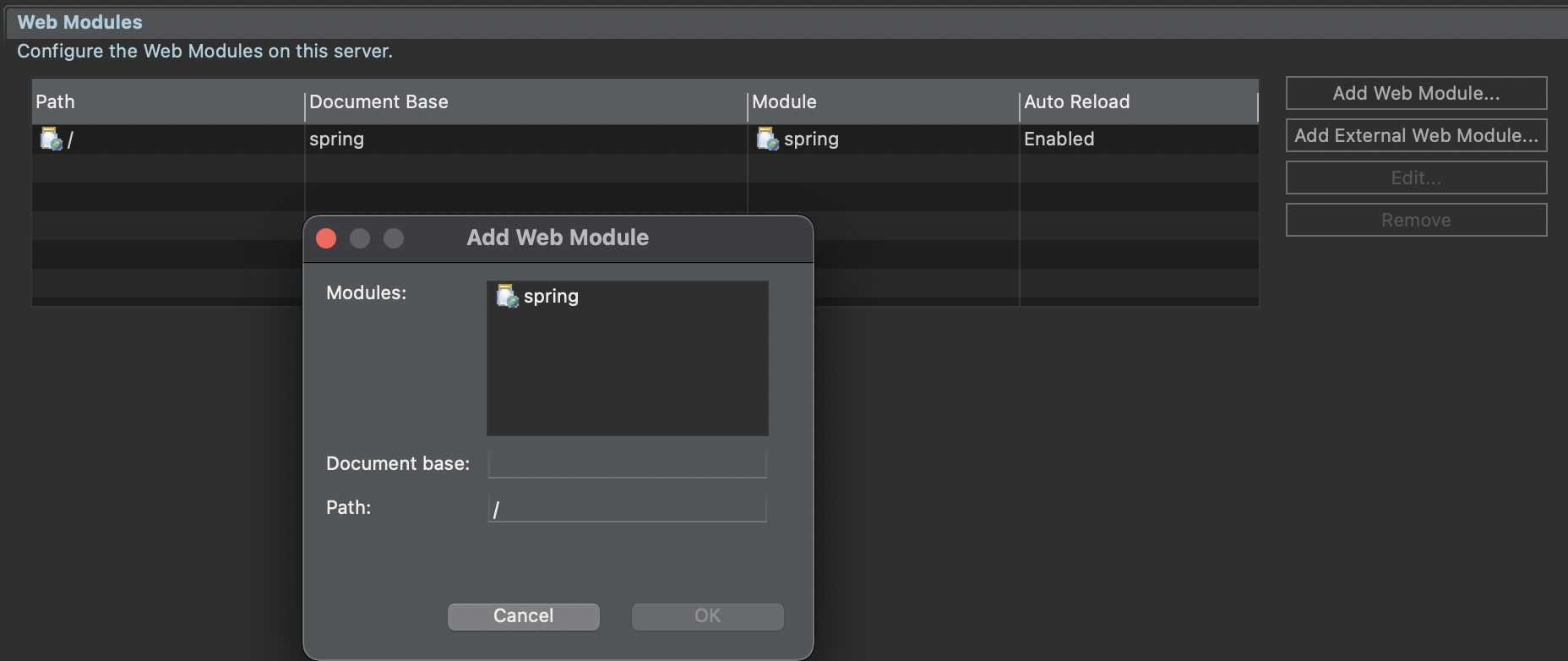 - 아래 사진에서 modules를 누르고 톰캣이 실행될 웹 루트 디렉토리 지정