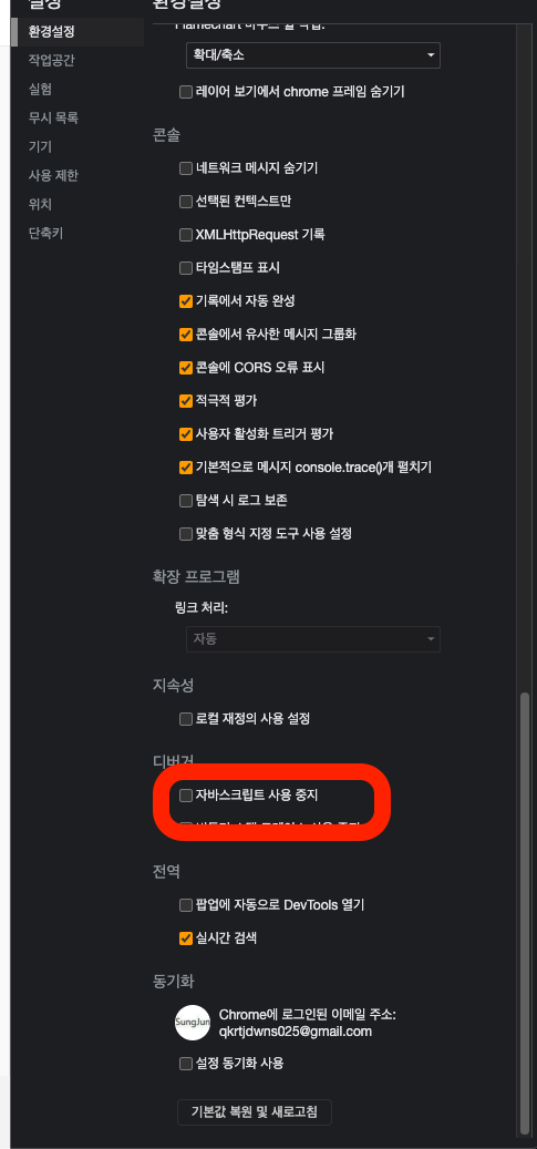 그럼 이를 해결하는 방법은 자바스크립트의 동작을 끄면 된다.