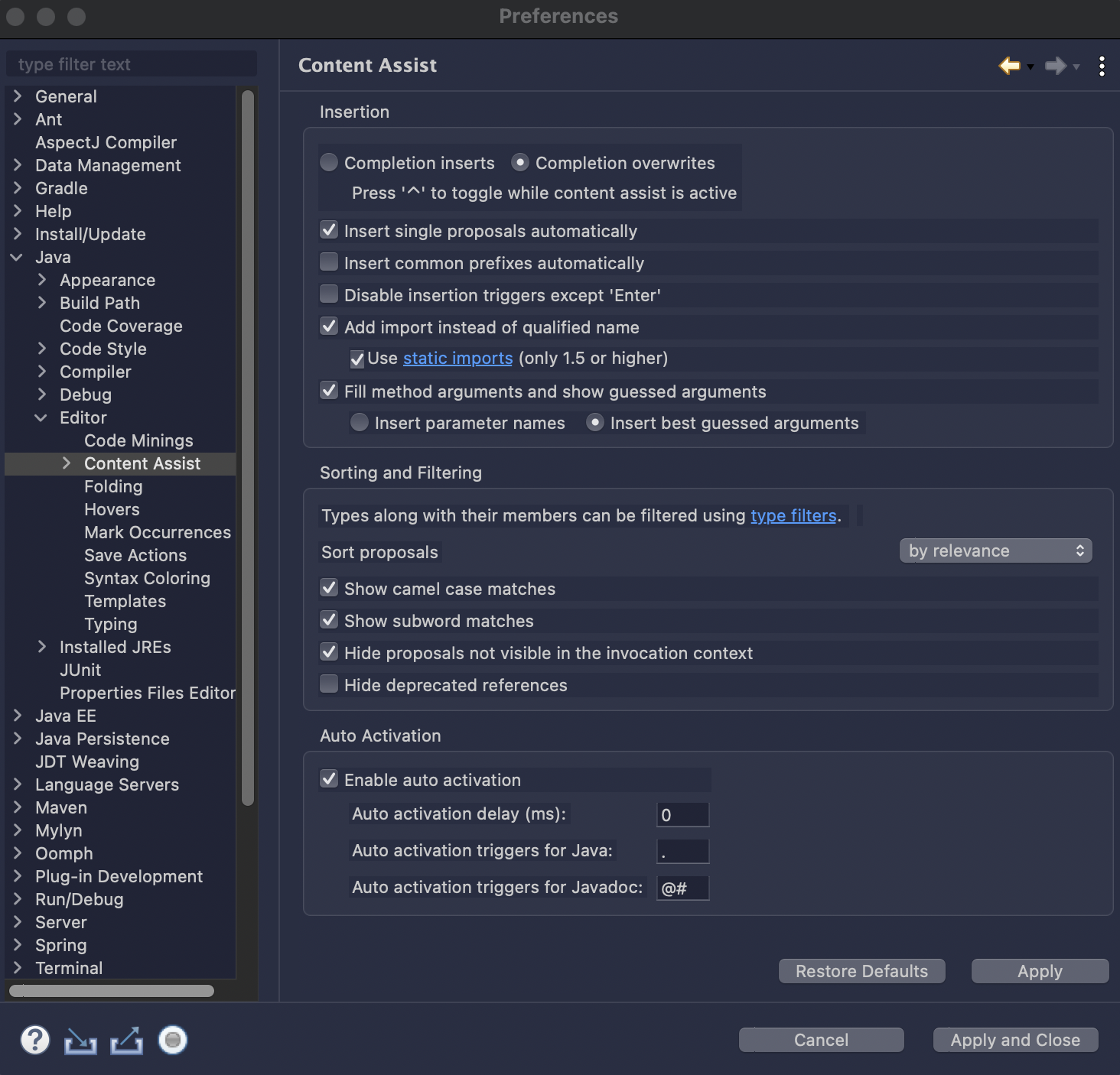Window -> Preferences -> Java-Editor-Content Assist 설정에 들어간다.
