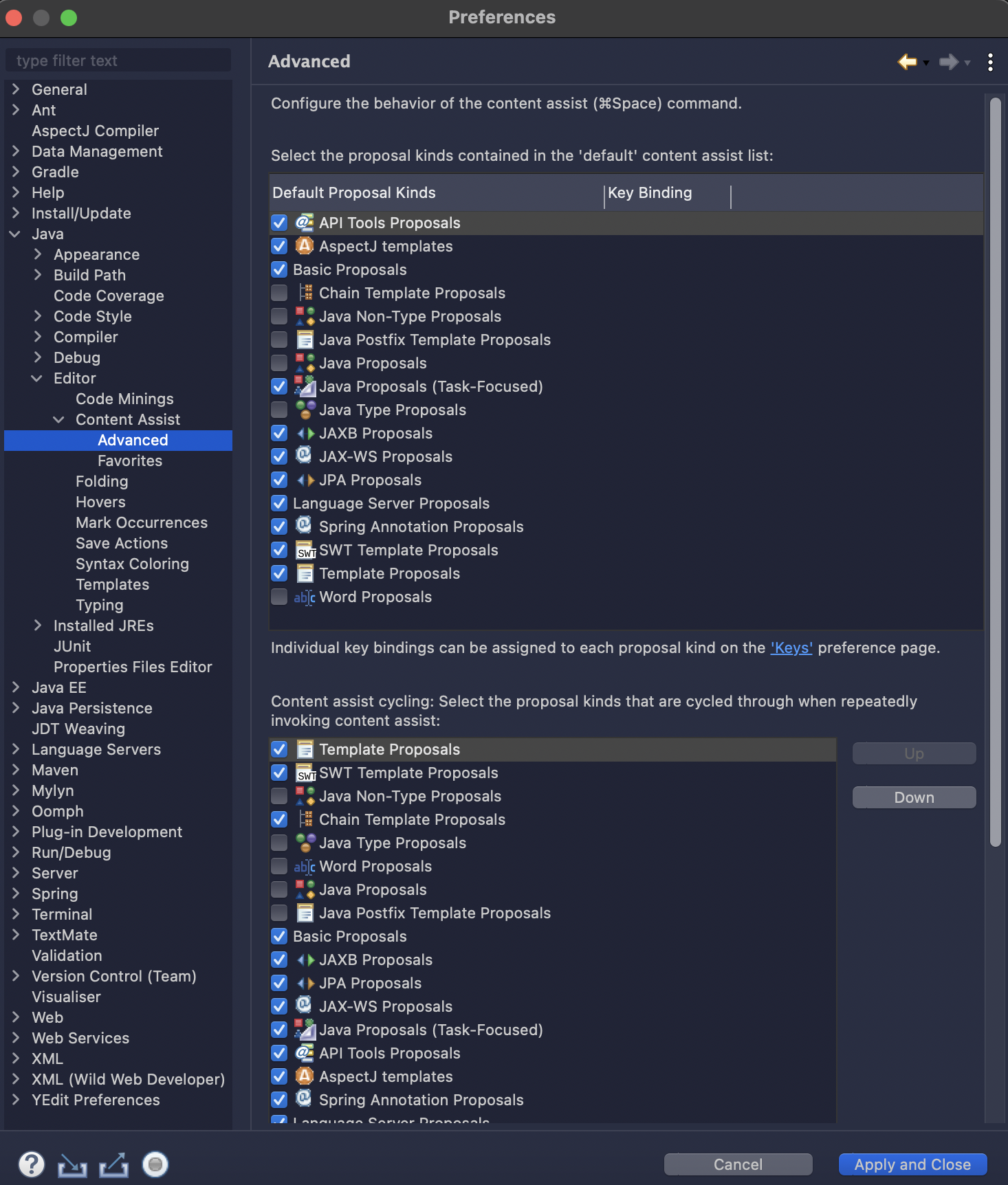 Window -> Preferences -> Java-Editor-Content Assist-Advanced 설정에 들어간다.