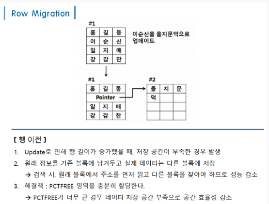 이 또한 이미지가 잘 설명하고 있지만. Row Migration 과의 차이는 Migration 은 Update 시에 , Chaining 은 Insert 라고 생각하면 된다. 처음에 저장부터 공간이 부족하여 다음 블록까지 넘어가서 저장을 할 경우이다.